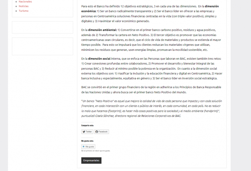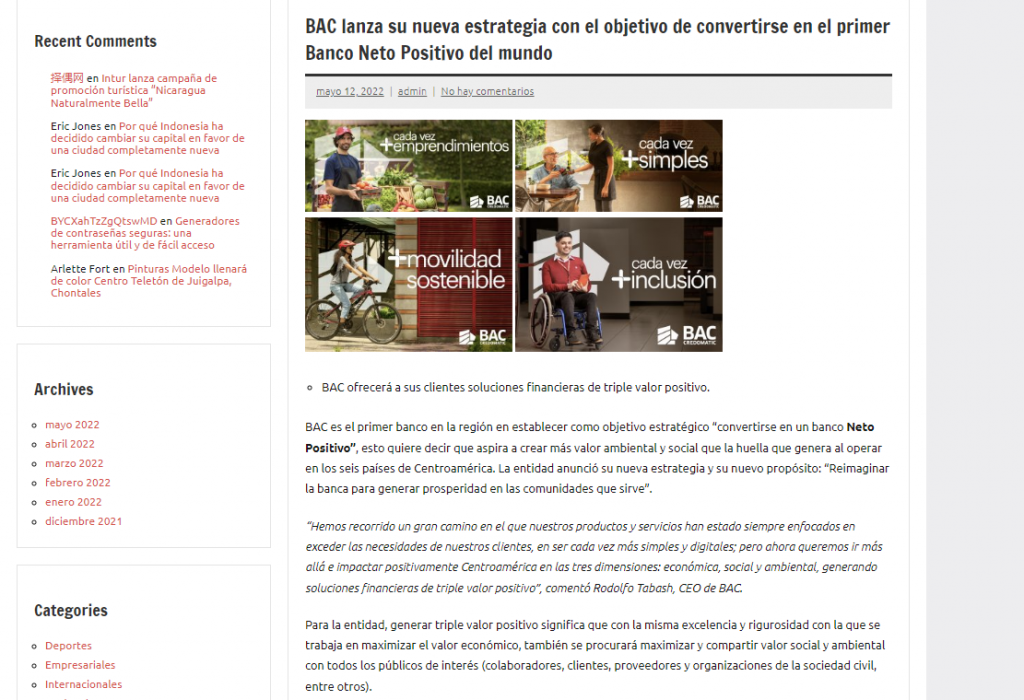 BAC es el primer banco en la región en establecer como objetivo estratégico “convertirse en un banco Neto Positivo”, esto quiere decir que aspira a crear más valor ambiental y social que la huella que genera al operar en los seis países de Centroamérica. La entidad anunció su nueva estrategia y su nuevo propósito: “Reimaginar la banca para generar prosperidad en las comunidades que sirve”.