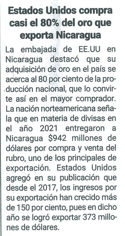 Estados Unidos compra casi el 80% del oro que exporta Nicaragua