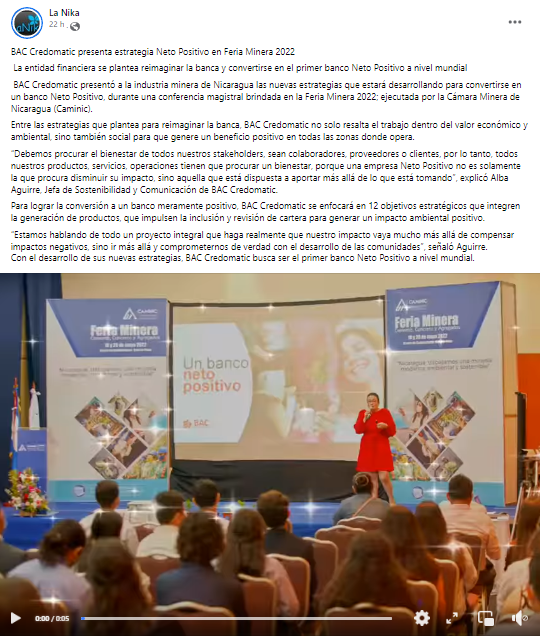 La entidad financiera se plantea reimaginar la banca y convertirse en el primer banco Neto Positivo a nivel mundial BAC Credomatic presentó a la industria minera de Nicaragua las nuevas estrategias que estará desarrollando para convertirse en un banco Neto Positivo, durante una conferencia magistral brindada en la Feria Minera 2022; ejecutada por la Cámara Minera de Nicaragua (Caminic). Entre las estrategias que plantea para reimaginar la banca, BAC Credomatic no solo resalta el trabajo dentro del valor económico y ambiental, sino también social para que genere un beneficio positivo en todas las zonas donde opera. “Debemos procurar el bienestar de todos nuestros stakeholders, sean colaboradores, proveedores o clientes, por lo tanto, todos nuestros productos, servicios, operaciones tienen que procurar un bienestar, porque una empresa Neto Positivo no es solamente la que procura disminuir su impacto, sino aquella que está dispuesta a aportar más allá de lo que está tomando”, explicó Alba Aguirre, Jefa de Sostenibilidad y Comunicación de BAC Credomatic. Para lograr la conversión a un banco meramente positivo, BAC Credomatic se enfocará en 12 objetivos estratégicos que integren la generación de productos, que impulsen la inclusión y revisión de cartera para generar un impacto ambiental positivo. “Estamos hablando de todo un proyecto integral que haga realmente que nuestro impacto vaya mucho más allá de compensar impactos negativos, sino ir más allá y comprometernos de verdad con el desarrollo de las comunidades”, señaló Aguirre. Con el desarrollo de sus nuevas estrategias, BAC Credomatic busca ser el primer banco Neto Positivo a nivel mundial.