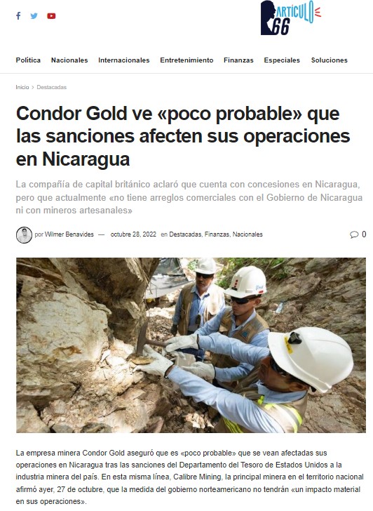 Condor Gold ve «poco probable» que las sanciones afecten sus operaciones en Nicaragua