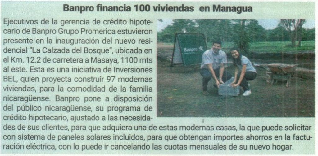 Banpro financia 100 viviendas en Managua