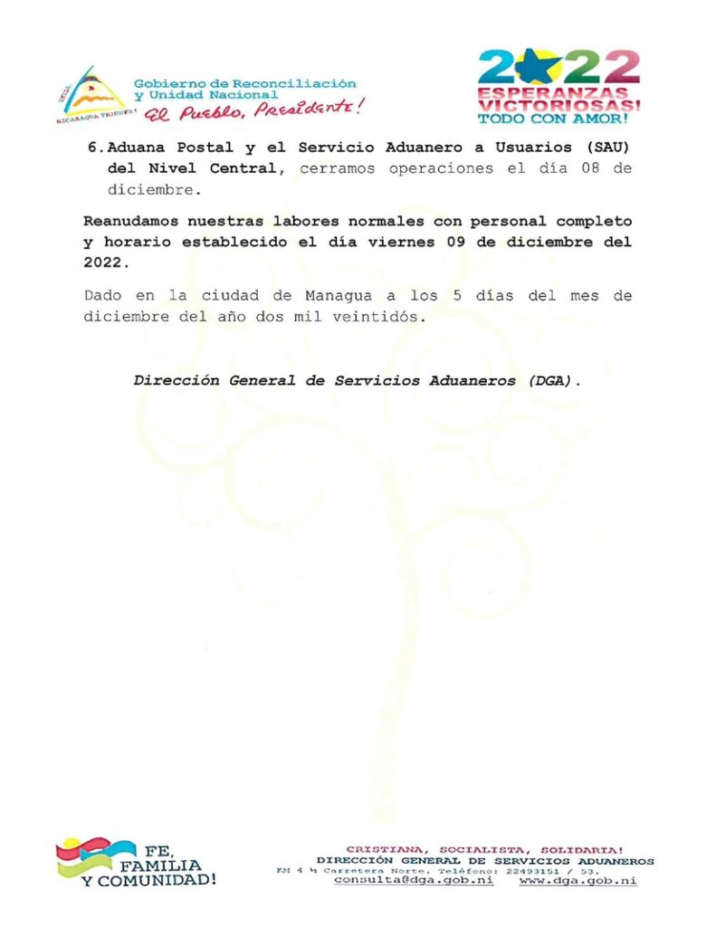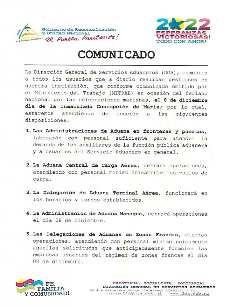 Comunicado de la Dirección General de Servicios Aduaneros (DGA), en ocasión de celebrar el 8 de diciembre las festividades en Honor de la Inmaculada Concepción de María.