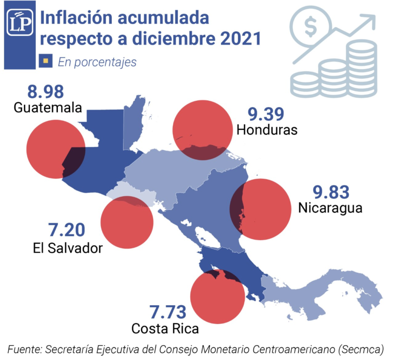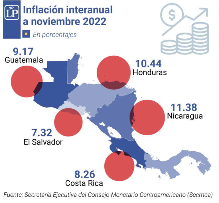 Asimismo, Nicaragua encabeza la mayor inflación interanual de la región centroamericana, con el 11.38 por ciento señalado anteriormente, seguido en el mismo orden de los países citados (Ver infografía).