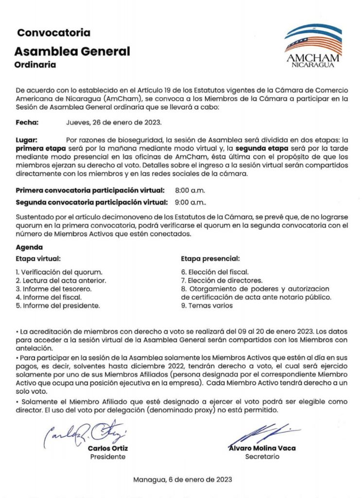 La Cámara de Comercio Americana de Nicaragua (AmCham) convoca a sus miembros a participar en la Sesión de Asamblea General Ordinaria que se llevará a cabo el jueves 26 de enero 2023. Por razones de bioseguridad, la sesión de Asamblea será dividida en dos etapas: la primera será por la mañana de forma virtual y la segunda será por la tarde de manera presencial en las oficinas de AmCham. La segunda etapa tiene el propósito de que los miembros ejerzan su derecho al voto.