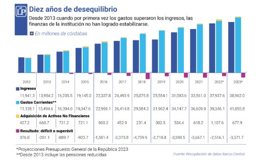 También las cifras preliminares que incorpora Hacienda en el proyecto de Presupuesto General de la República 2023, donde se anticipa un aumento del déficit financiero este año (3,572 millones de córdobas) respecto al 2022, que habría cerrado en 2,516 millones de córdobas.