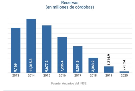 En el 2020, según el documento, las reservas técnicas de la entidad ascendieron a 273.24 millones de córdobas, por debajo de los 1,314 millones de córdobas observados en el 2019 y muy inferior a los 11,015 millones de córdobas en el 2014, el máximo que se registró desde que la entidad cayó en crisis financiera en el 2013 y desde entonces ha acumulado enormes déficits financieros.