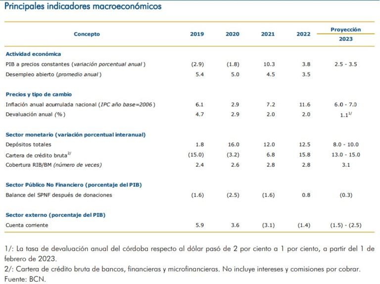 El pasado 31 de enero, el presidente del BCN, Ovidio Reyes dijo ante diputados que para este año esperaban que el Producto Interno Bruto (PIB) se expandiera en un rango de entre 3 y 4 por ciento, y que la inflación oscilara entre 5 y 6 por ciento.