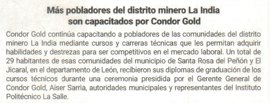Más pobladores del distrito minero La India son capacitados por Condor Gold