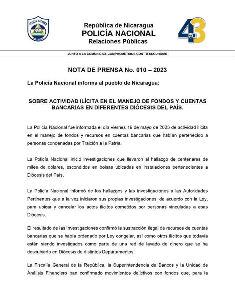 Otro dato curioso del comunicado es que según la Policía encontraron “cientos de miles de dólares escondidos en bolsas ubicadas en instalaciones pertenecientes a las Diócesis del país”.