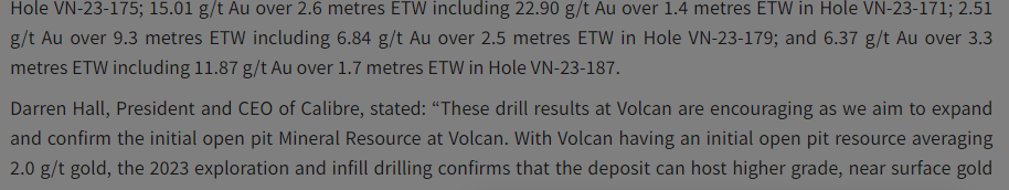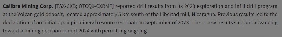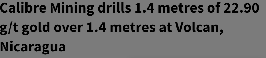 Calibre Mining drills 1.4 metres of 22.90 g/t gold over 1.4 meter at Volcan Nicaragua