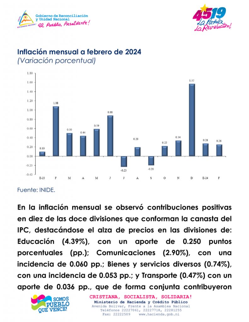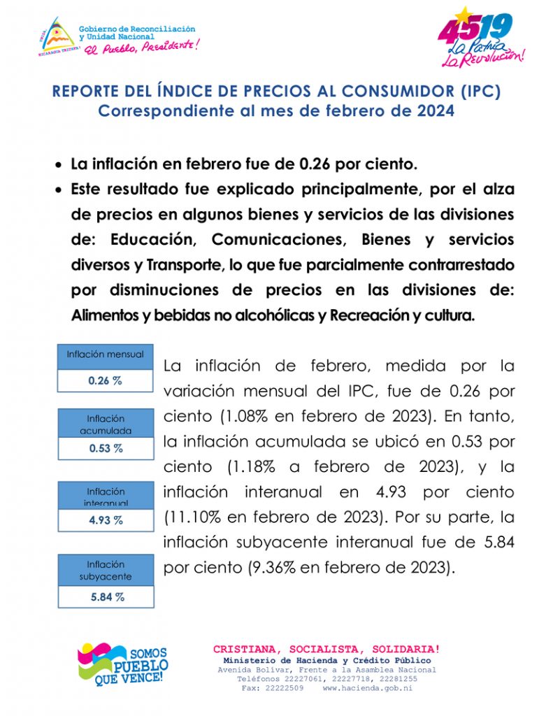 La inflación de febrero, medida por la variación mensual del IPC, fue de 0.26 por ciento (1.08% en febrero de 2023). En tanto, la inflación acumulada se ubicó en 0.53 por ciento (1.18% a febrero de 2023), y la inflación interanual en 4.93 por ciento (11.10% en febrero de 2023). Por su parte, la inflación subyacente interanual fue de 5.84 por ciento (9.36% en febrero de 2023).