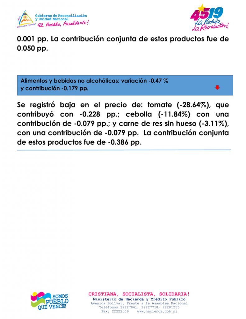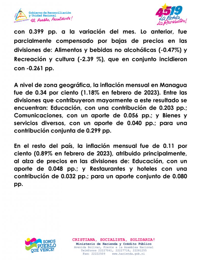En la inflación mensual se observó contribuciones positivas en diez de las doce divisiones que conforman la canasta del IPC, destacándose el alza de precios en las divisiones de: Educación (4.39%), con un aporte de 0.250 puntos porcentuales (pp.); Comunicaciones (2.90%), con una incidencia de 0.060 pp.; Bienes y servicios diversos (0.74%), con una incidencia de 0.053 pp.; y Transporte (0.47%) con un aporte de 0.036 pp., que de forma conjunta contribuyeron con 0.399 pp. a la variación del mes. Lo anterior, fue parcialmente compensado por bajas de precios en las divisiones de: Alimentos y bebidas no alcohólicas (-0.47%) y Recreación y cultura (-2.39 %), que en conjunto incidieron con -0.261 pp.