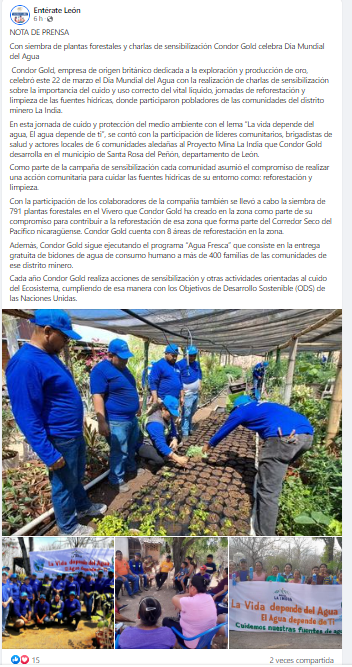 Con siembra de plantas forestales y charlas de sensibilización Condor Gold celebra Día Mundial del Agua