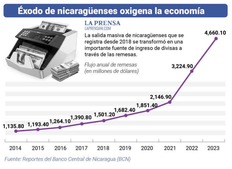 El año pasado Nicaragua recibió 4,660 millones de dólares en remesas, monto superior en 44.5 por ciento en comparación con los 3,224 millones captados durante el 2022. Esto lo ubicó como el país de la región con el mayor crecimiento de estos recursos, ya que en Centroamérica, estos flujos solo crecieron 9.1 por ciento. Sin embargo, en Nicaragua la salida de unas 800 mil personas que desde el estallido de la crisis sociopolítica, huyeron de la represión política o de la crisis económica, provocó este incremento.