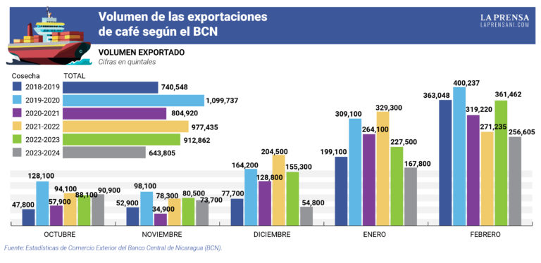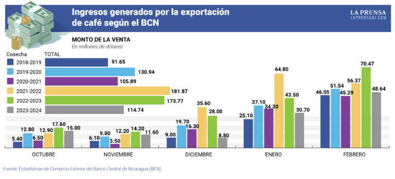 Mientras tanto, los informes de comercio exterior del Banco Central de Nicaragua (BCN) detallan que entre octubre del 2023 y febrero de 2024 se enviaron al exterior de 643,805 quintales del llamado grano de oro; volumen menor en 30 por ciento en relación con los 912,862 quintales exportados en los mismos meses de la cosecha 2022-2023. Las ventas del periodo analizado en la actual cosecha generaron 114.74 millones de dólares, monto inferior en 34 por ciento en relación con los 173.77 millones de dólares generados entre octubre de 2022 y febrero de 2023.