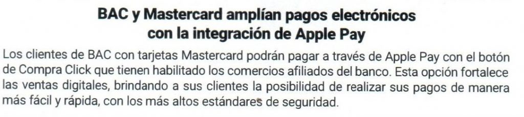 BAC y Mastercard amplían pagos electrónicos con la integración de Apple Pay