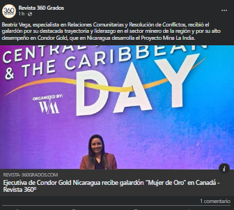La prestigiosa organización Women in Mining Central America entregó en la ciudad de Toronto, Canadá, el Galardón “Mujer de Oro” a nuestra especialista en Relaciones Comunitarias y Resolución de Conflictos, licenciada Beatriz Vega, por su destacada trayectoria y liderazgo en el sector minero de la región y por su alto desempeño en nuestra compañía Condor Gold, que en Nicaragua desarrolla el Proyecto Mina La India.