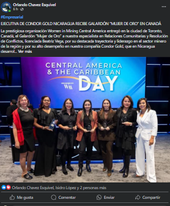 La prestigiosa organización Women in Mining Central America entregó en la ciudad de Toronto, Canadá, el Galardón “Mujer de Oro” a nuestra especialista en Relaciones Comunitarias y Resolución de Conflictos, licenciada Beatriz Vega, por su destacada trayectoria y liderazgo en el sector minero de la región y por su alto desempeño en nuestra compañía Condor Gold, que en Nicaragua desarrolla el Proyecto Mina La India.