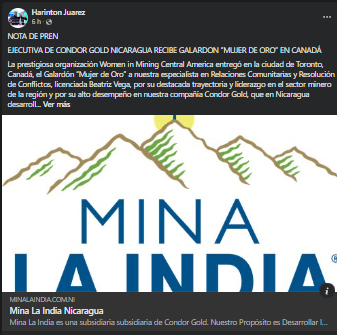 Este reconocimiento a la licenciada Vega subraya el compromiso y la influencia de las colaboradoras de Condor Gold en la industria minera nicaragüenses y en pro del crecimiento social y económico de las comunidades aledañas a nuestro proyecto Mina La India, que se desarrolla en los municipios de Santa Rosa del Peñón y El Jicaral, departamento de León .