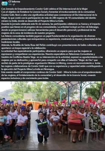 La actividad fue especialmente participativa, ofreciendo un espacio para que las mujeres se expresaran y compartieran sus experiencias. Nuestra especialista en Relaciones Comunitarias y Gestión de Conflictos Beatriz Vega  en su intervención en la actividad, expresó su agradecimiento a las mujeres por su dedicación, y aprovechó para compartir con ellas el Galardón “Mujer de Oro” que recibió de parte de la prestigiosa organización Women in Mining, como un reconocimiento a  todas las mujeres colaboradoras de Condor Gold que con su experiencia y capacidad están contribuyendo a la ejecución del Proyecto Mina La India en Nicaragua.