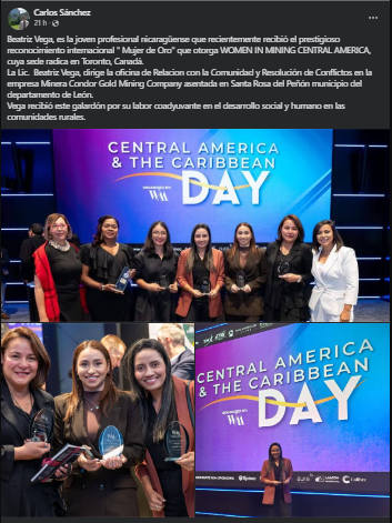 La prestigiosa organización Women in Mining Central America entregó en la ciudad de Toronto, Canadá, el Galardón “Mujer de Oro” a nuestra especialista en Relaciones Comunitarias y Resolución de Conflictos, licenciada Beatriz Vega, por su destacada trayectoria y liderazgo en el sector minero de la región y por su alto desempeño en nuestra compañía Condor Gold, que en Nicaragua desarrolla el Proyecto Mina La India.