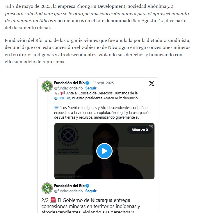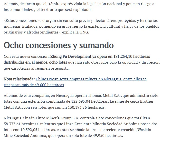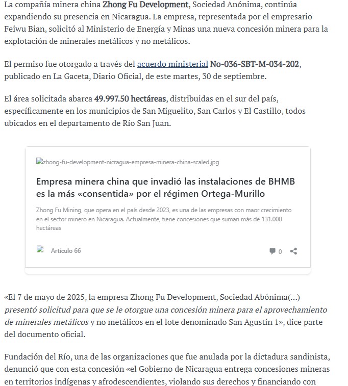 Nicaragua concedió a la minera china Zhong Fu Development otras 49.997 hectáreas en el departamento de Río San Juan, elevando el control total de la empresa a más de 18.254 hectáreas de territorio nicaragüense.